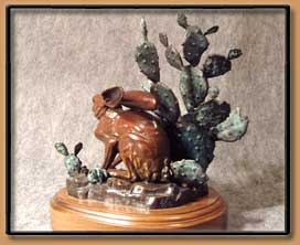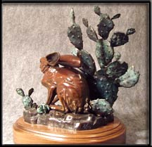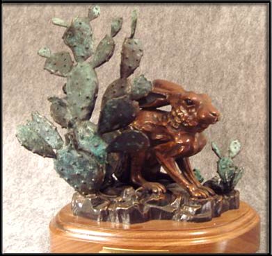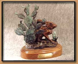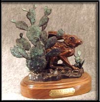 The Texas Black tailed jackrabbit is a member of the Hare family. Always on guard the Jackrabbit depends on its keen sense of hearing and sight to elude predators. His powerful hind legs provide the power and quickness to escape when threatened. When danger is sensed, the Jackrabbit will crouch and lay its long ears down. In this sculpture "Texas Jack" is barely hidden in a clump of Prickly Pear.