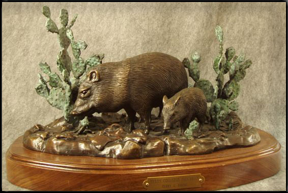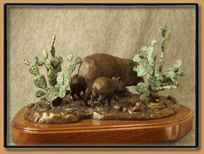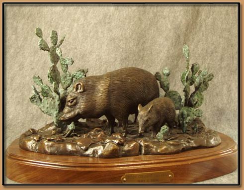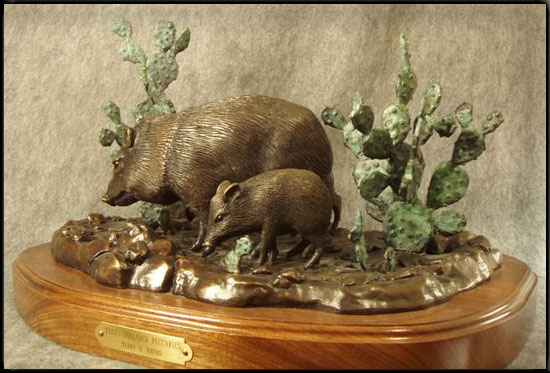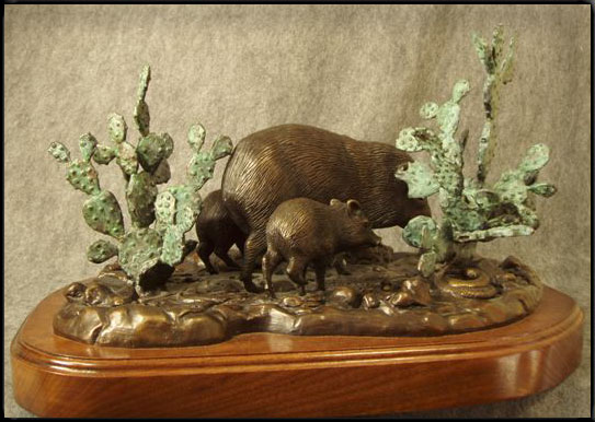 Texas collared Peccaries (often called "Javalina") roam southwestern Texas. Active in the early morning and late afternoon, a Mother and two young ones range for food among thickets of Prickly Pear in a dry creek bed. This Bronze depicts the young Javalina discovering an unwelcome companion at the base of a Prickly Pear.